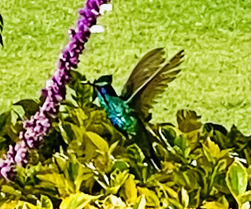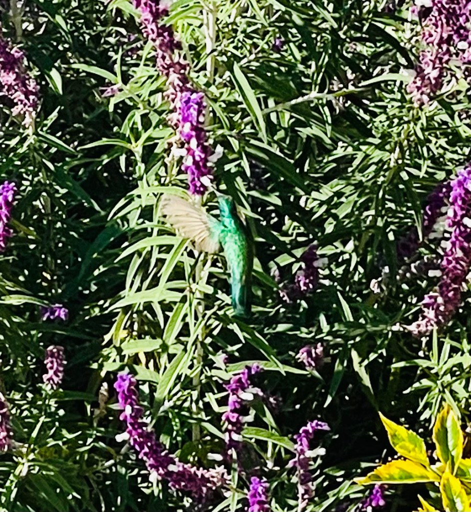 And just as I was crawling my way up the hotel walkway I spotted this hummingbird on a lavender bush. I know it is not a great shot, but the bird is nearly entirely luminescent and about 3 times the size of hummingbirds at home.