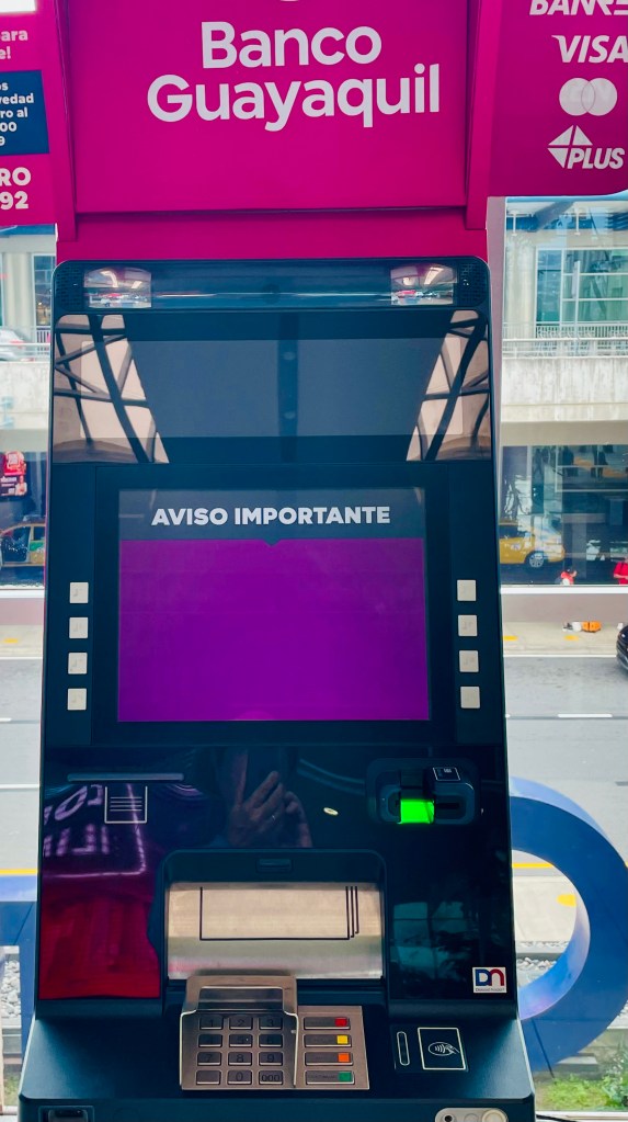 Our guide, Ana, had advised us that this was the least expensive bank in the area. She said they only charged $1.50 per transaction; she was wrong, the charge was $1.52. We accepted. You may recall that Guayaquil is the port city where the television station was overrun.