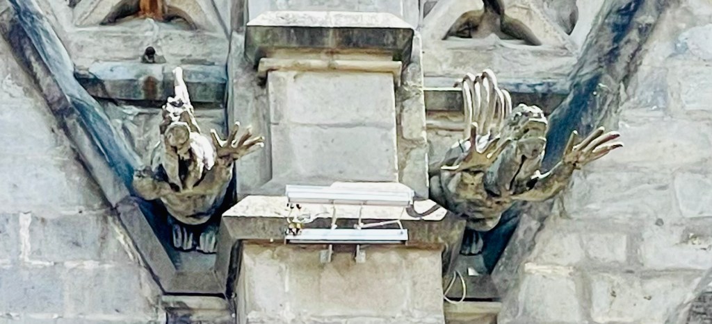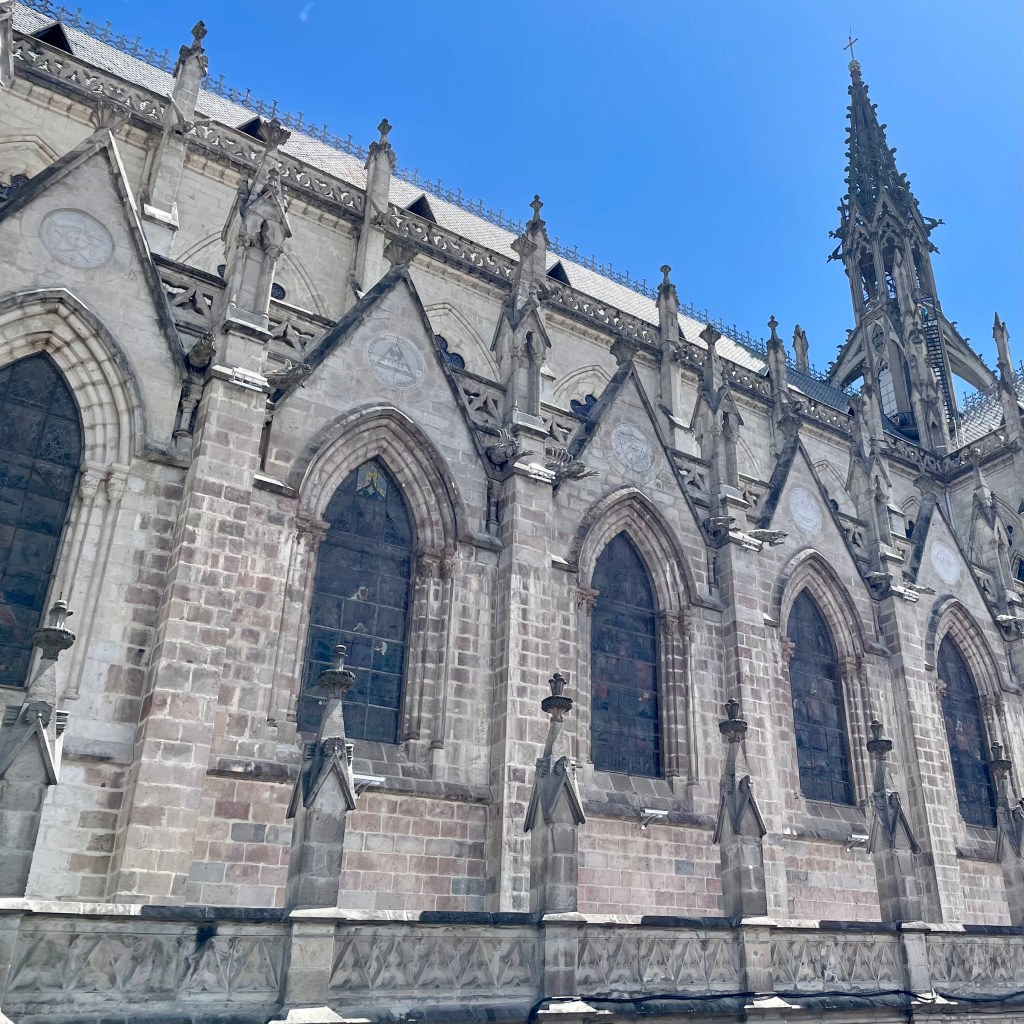We visited the Basilica of the National Vow church high on a hill in central Quito. The vow was to pledge the country to the sacred heart of Jesus. It is modeled after Notre Dame in Paris complete with gargoyles with a twist. The gargoyles depict local creatures including turtles, iguanas and fish. At the time of construction, a fear arose that when the cathedral was finished, the world would end. Wisely, they never completely finished the project even though the work spanned 85 years.