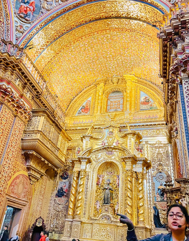 There was much more to see in central Quito including the Metropolitan Cathedral of Quito. It is a gilded (lots of gild) and is very awe inspiring just as the Spanish builders intended. This is a small portion of the cathedral. That’s Ana lecturing in the corner.