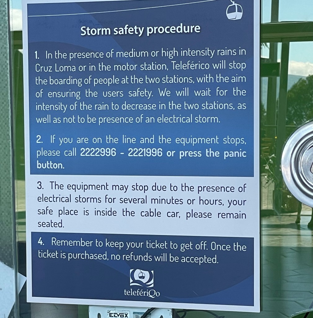 Today there was an optional tour to a hot springs and spa. J opted to go. The 8 AM departure time and the 90 minute bus ride discouraged the rest of us. Ana arranged for Fernando to take us (Lance, Pat and I) to the aerial tram at the edge of town. The tram ride takes us up to 13,000 feet. We were encouraged by the concern of the operators who posted helpful information for us travelers.