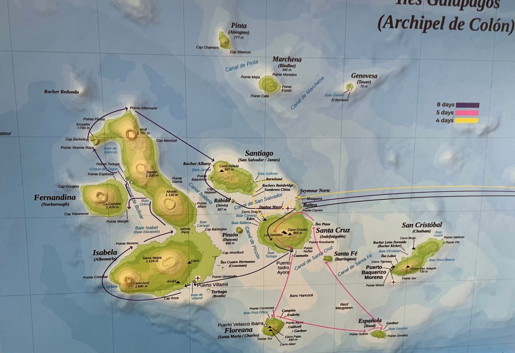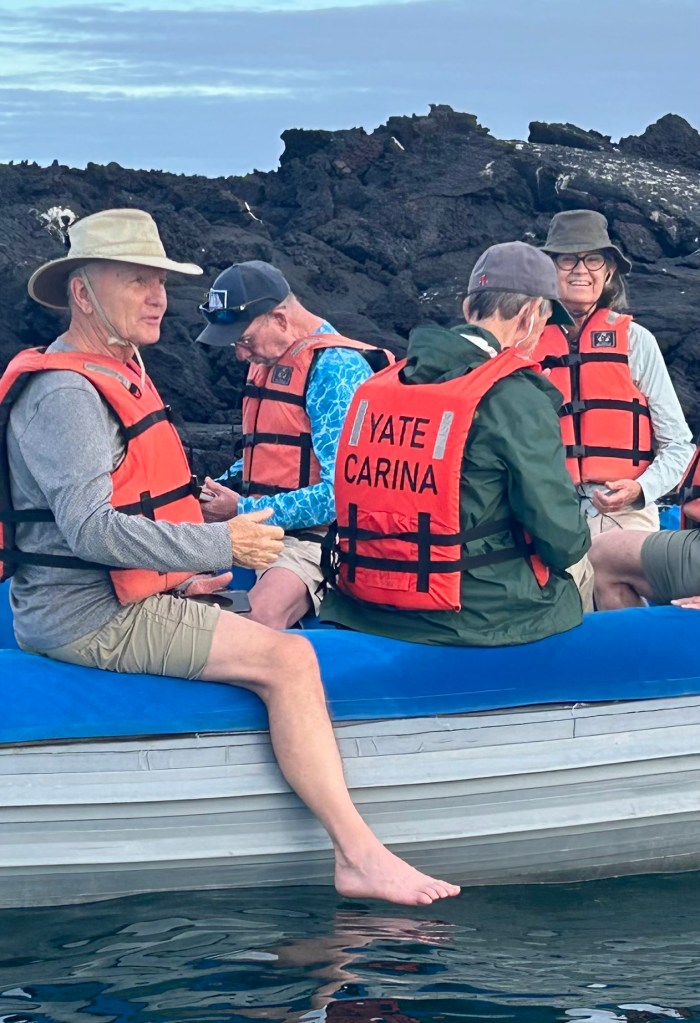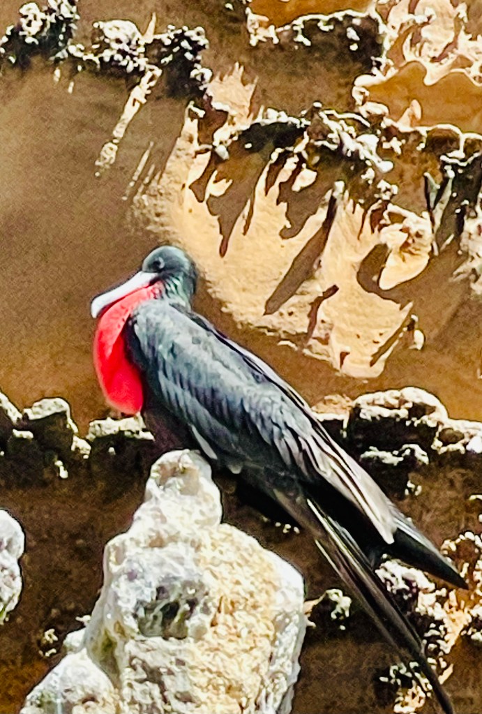 Yes, this will be the last post. I am in the nearly deserted main cabin after lunch. The meals come frequently and I haven’t passed up a desert yet. I can still squeeze into my wetsuit. Today’s snorkeling was the best so far. We swam through thousands of anchovy and enjoyed them glistening and suddenly shifting direction. Anchovies are being overfished along with sardines. The small fish are ground up and used for animal feed as well as feed for farmed fish. A chain reaction of extinctions could follow. In 2019, Ecuador alone harvested 2.1 million metric tons of anchovies.