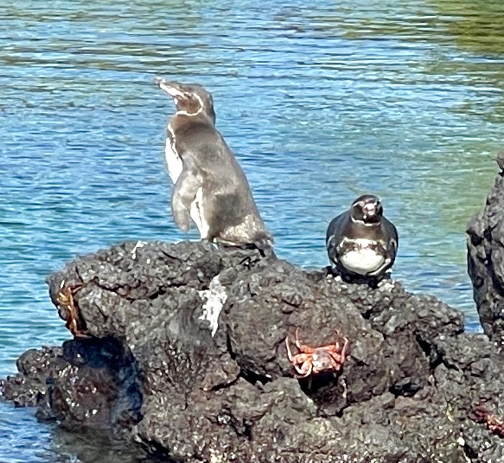 Galapogos penguins with sally lightfoot crab.