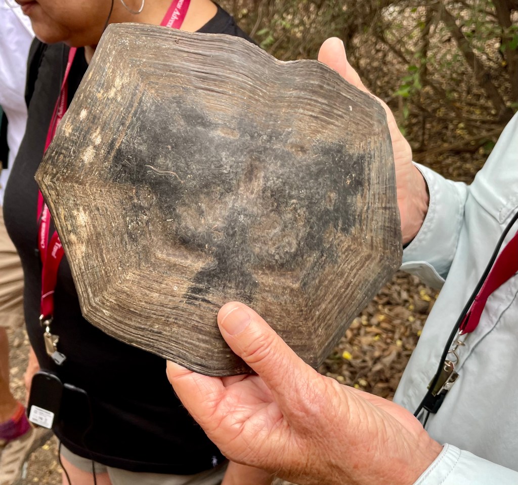 A tortoise skeleton and the outer protective material. The outer covering is tough but pliable. Peter said that this was a female about 100 years old. He also noted that tortoises can store water in their porous bones.