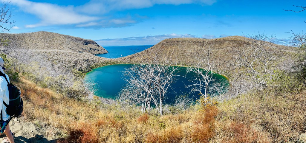 Darwin Lake on Isabela. The lake is comprised of salt water that leaches through the land barrier from the sea. Because it evaporates more quickly, it is much saltier than the ocean and therefore contains little life.