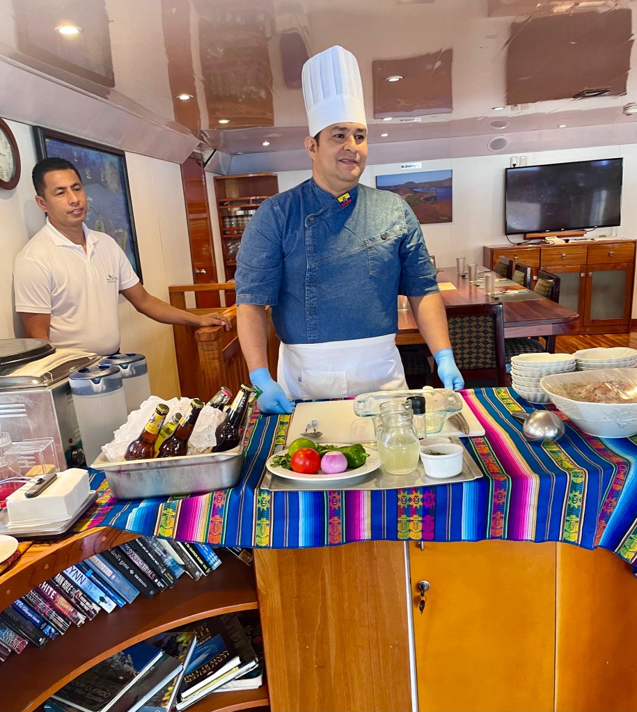 Our chef demonstrating the art of Ecuadorin ceviche. Juan, our dining staff is also in the photo.