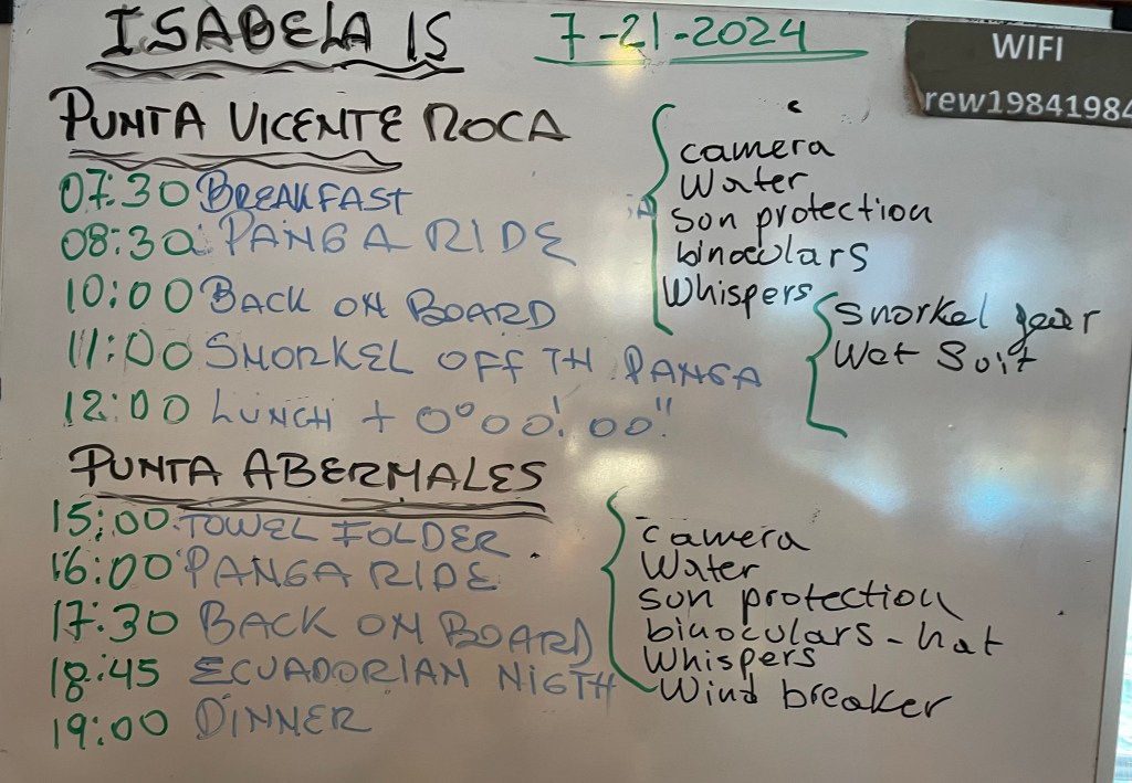 Our daily activity board for yesterday. Today we have one more snorkel and a beach walk with a wet landing. Lance is the only one who has snorkeled each opportunity. I sat out two trips.