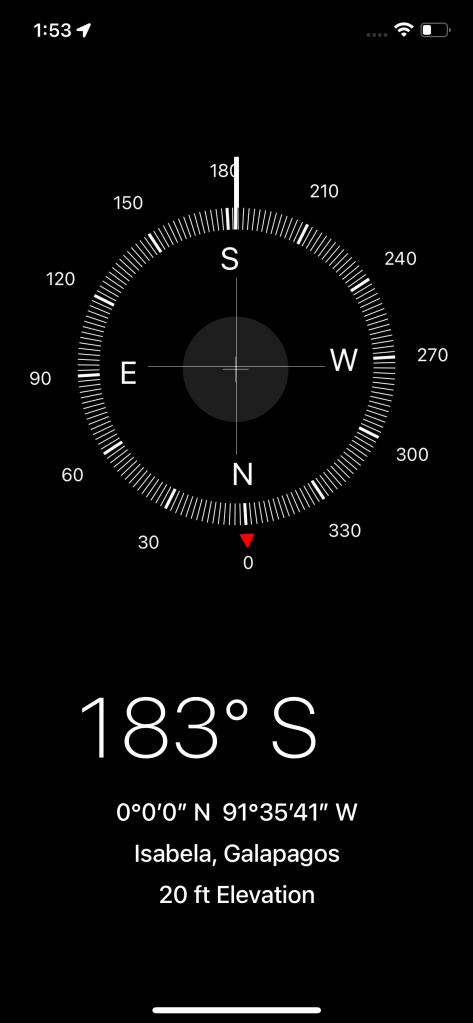 I have enjoyed writing this blog, but at times I felt a bit too preoccupied with it. I have to be online to write, which means being in the main cabin. This is where people gather before and after an outing making privacy difficult. Yesterday, I took the day off and really enjoyed the rhythms and feel of the islands without thinking about writing. This is probably my last post for this journey. The Galápagos Islands are wondrous. There is something special about being on the equator. Our crossing is documented near the top of Isabela Island.